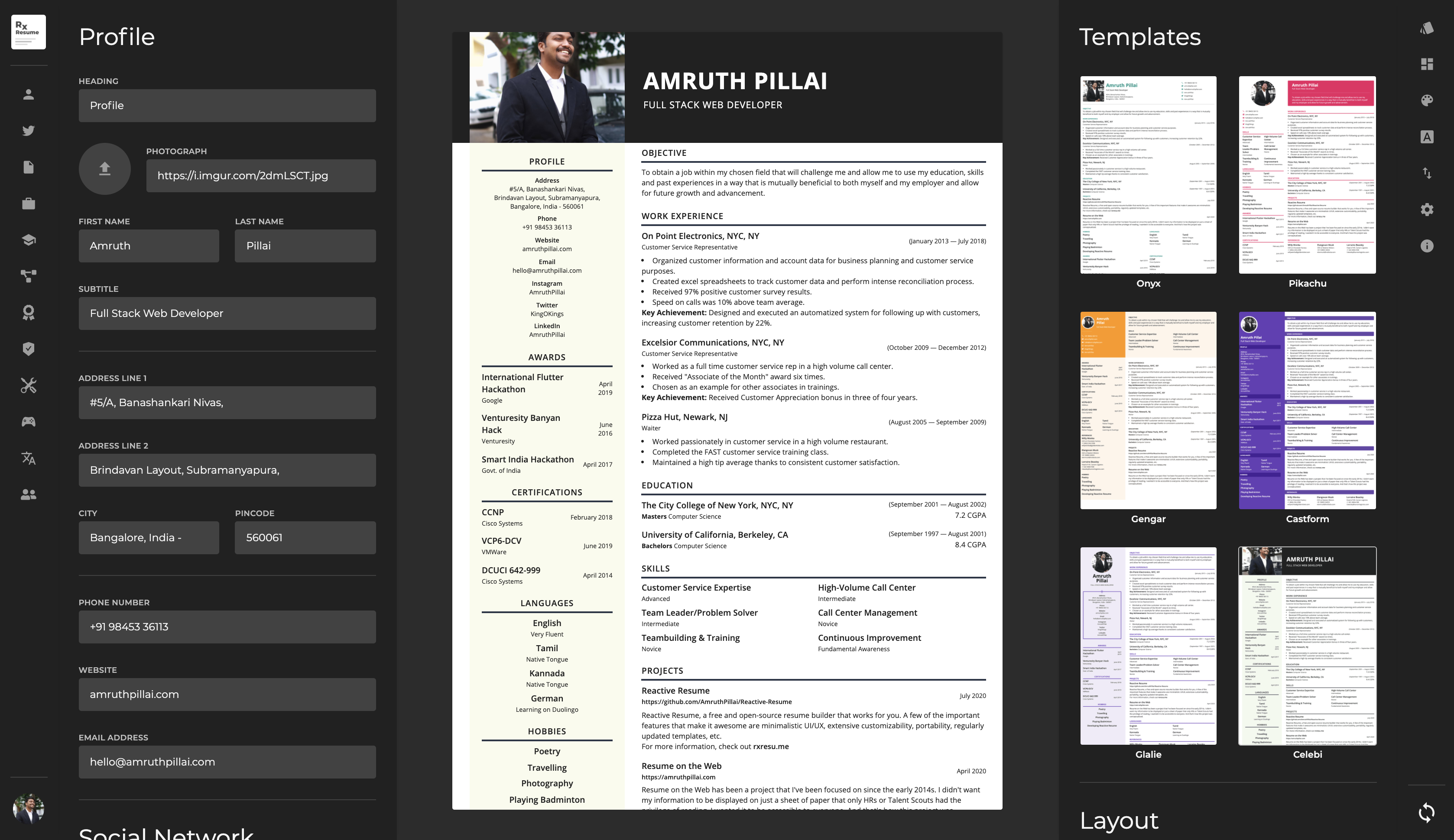 Reactive Resume is a free and open source resume builder that’s built to make the mundane tasks of creating, updating and sharing your resume as easy as 1, 2, 3. With this app, you can create multiple resumes, share them with recruiters through a unique link and print as PDF, all for free, no advertisements, without losing the integrity and privacy of your data.